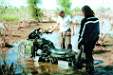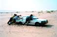 kupa peska. Avtomobile družno porivamo, da se izkopljejo iz peščene pasti. Trije motoristi,